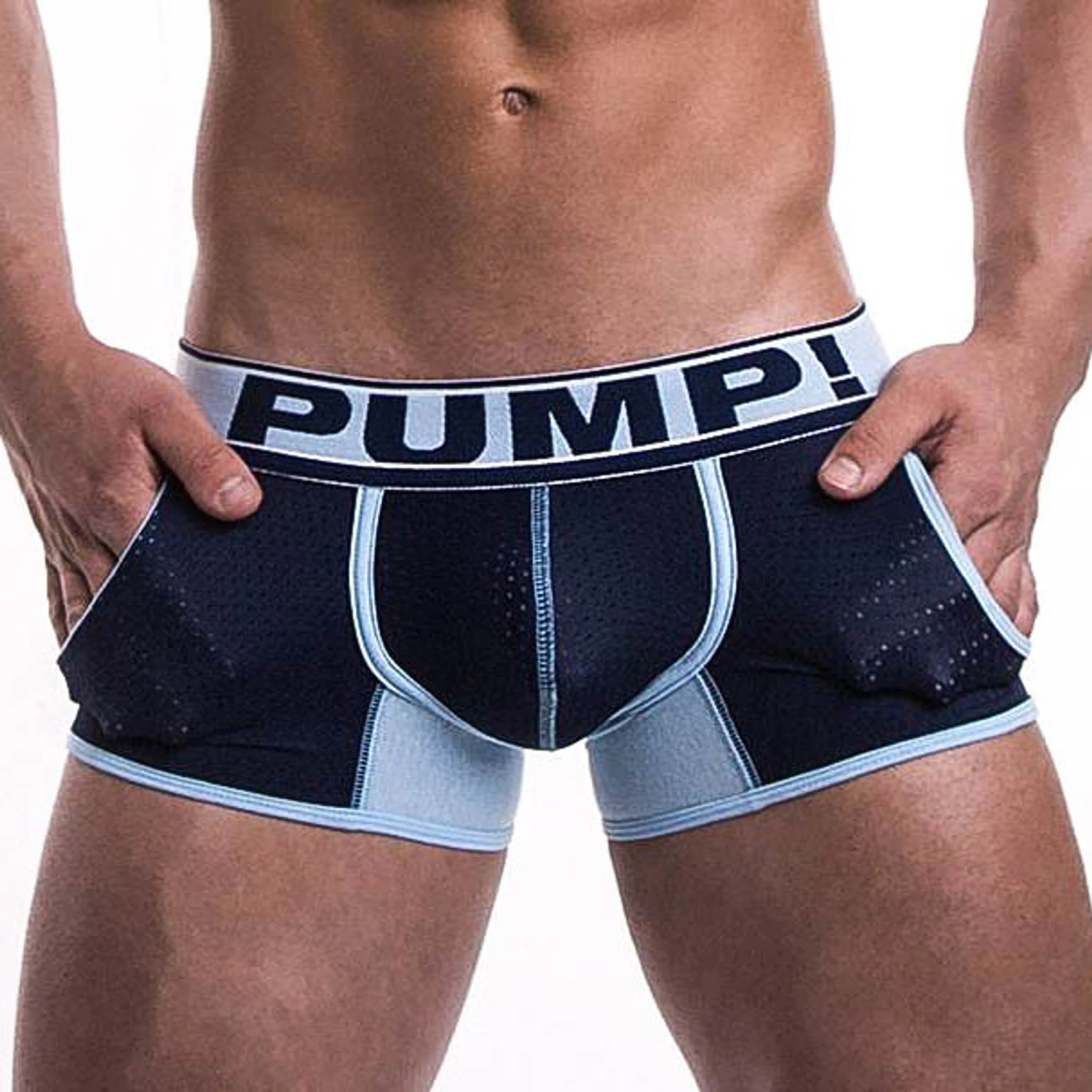 Blue and navy cotton boxer with navy mesh pockets.